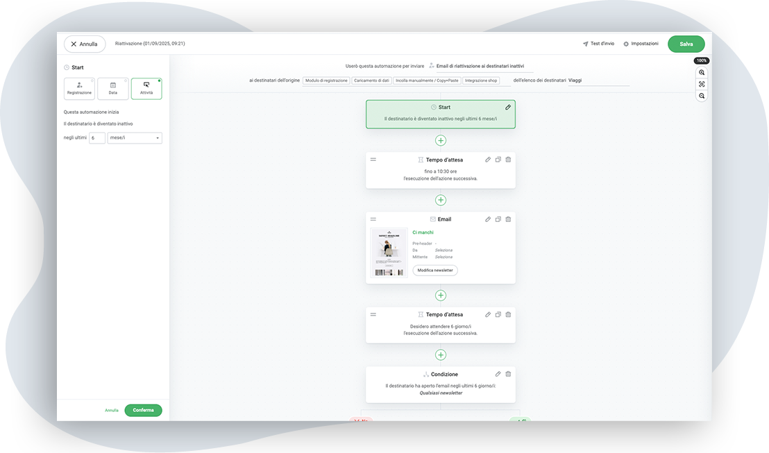 - 💰 Risparmiare tempo e risorse: queste email vengono inviate automaticamente non appena un contatto resta inattivo per un certo periodo. Così riconquisti utenti dormienti senza sprechi.