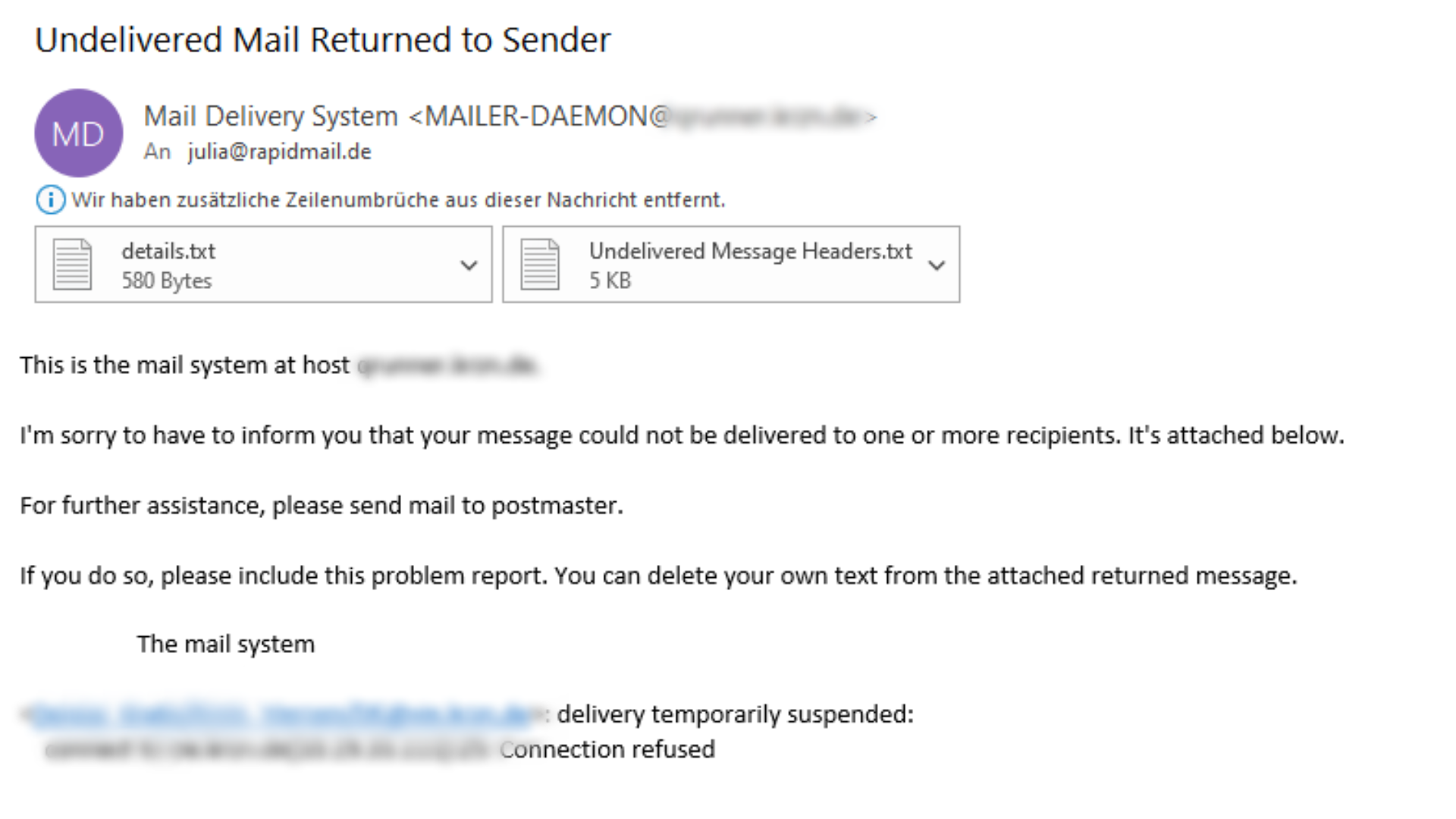 Gli indirizzi email a cui non è possibile recapitare messaggi in modo permanente vengono automaticamente rimossi dall’elenco dei contatti attivi dal software per newsletter rapidmail e classificati come "bounced". In questo modo eviti di inviare ripetutamente email a indirizzi errati, prevenendo il rischio di danneggiare la tua reputazione come mittente affidabile di newsletter. Questo potrebbe influire negativamente sulla deliverability generale della tua newsletter, ed è per questo che è fondamentale intervenire tempestivamente per risolvere i problemi legati agli indirizzi che hanno causato un hard bounce.