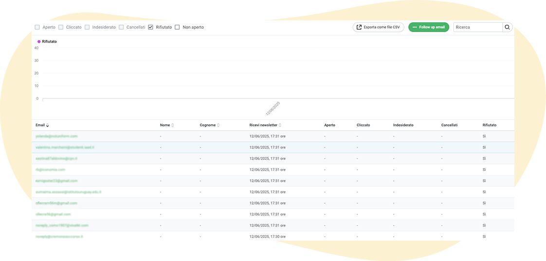 Per un’analisi più approfondita, ti basta accedere alle statistiche della singola newsletter e andare alla sezione “Attività destinatario”. Lì puoi visualizzare solo gli indirizzi email per cui l’invio è fallito, così da individuare rapidamente eventuali pattern. Ad esempio, se i bounce provengono tutti dallo stesso provider, è molto probabile che tu sia stato inserito nella sua blacklist.