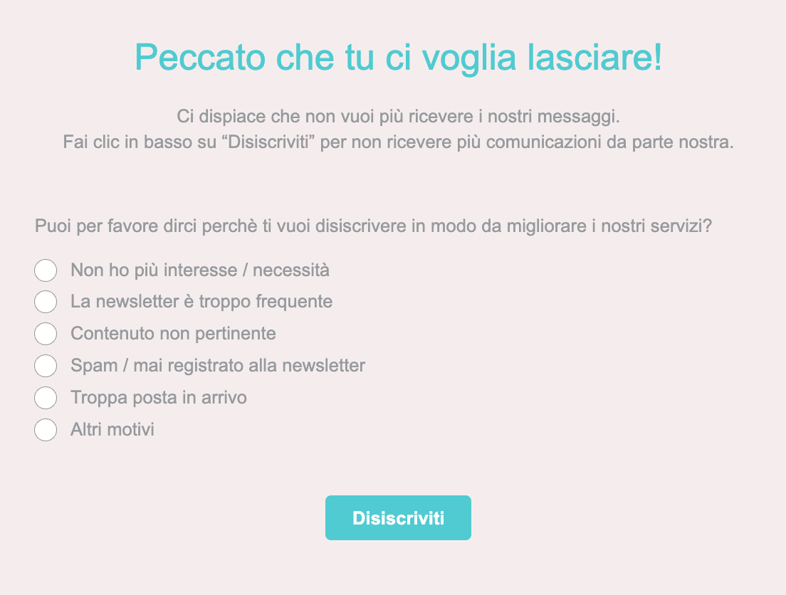Se vuoi andare sul sicuro, la tua pagina di disiscrizione dovrebbe essere il più possibile chiara, semplice e trasparente.