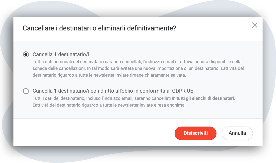 Con rapidmail sei sempre in regola: puoi scegliere tra la disiscrizione classica o la cancellazione completa, in base a ciò che ti viene richiesto. In ogni caso, proteggi i dati e il tuo brand.