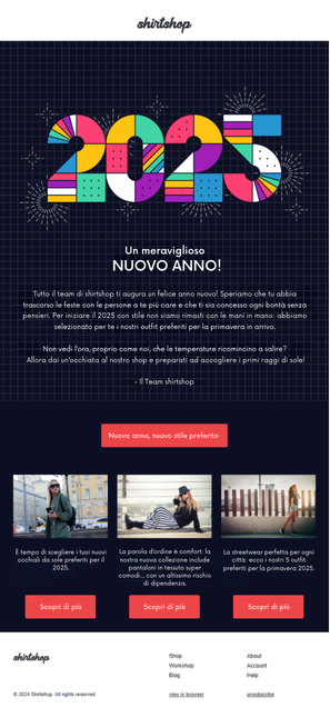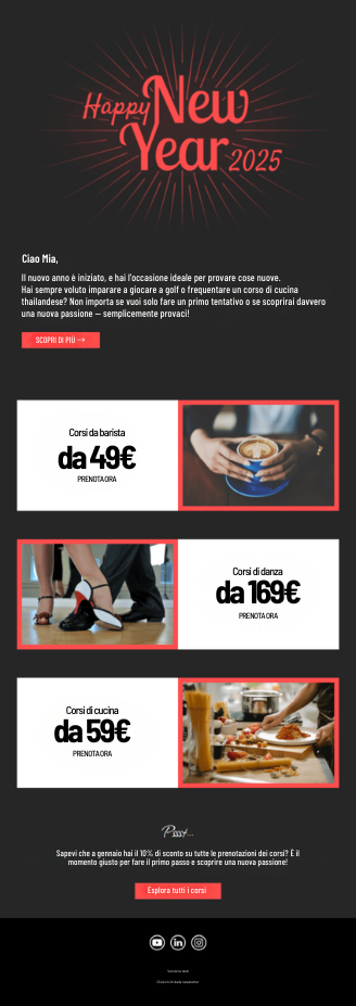 Se desideri inviare la tua newsletter prima di Capodanno, per augurare ai tuoi clienti un buon inizio, puoi farlo subito dopo le comunicazioni natalizie oppure integrare i due messaggi in un’unica email.
