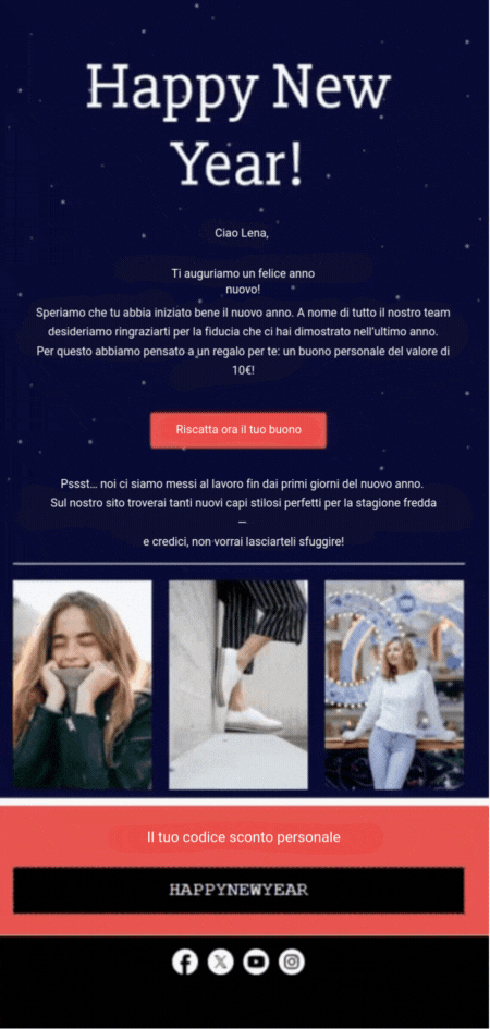 Rendi i tuoi auguri di Capodanno personali e creativi per lasciare un ricordo positivo e duraturo nei tuoi contatti. Utilizza un saluto personalizzato con il nome del destinatario, arricchisci la newsletter con elementi visivi come immagini o GIF a tema inizio anno e inserisci citazioni capaci di ispirare e motivare.