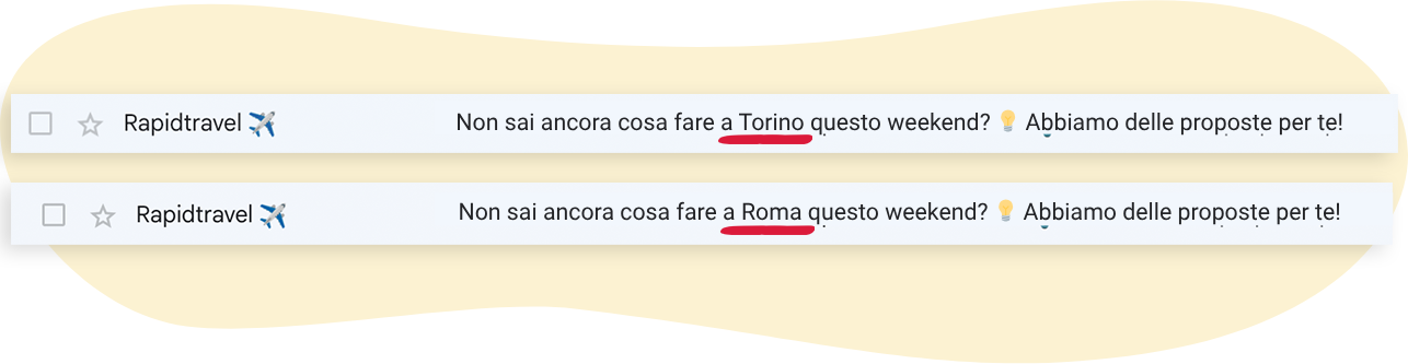 Vuoi far sentire speciali i tuoi iscritti? Aggiungi il loro nome o la città dove vivono nell’oggetto. È un tocco personale che aumenta il tasso di apertura e crea una connessione diretta, anche prima che l’email venga aperta.
