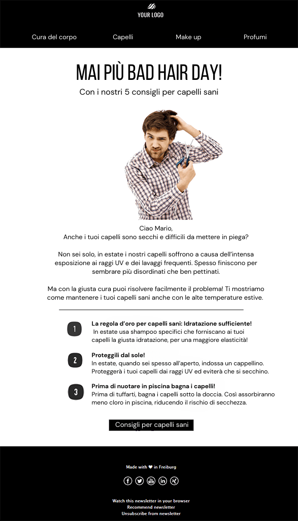 Sia per l'oggetto della newsletter che per il preheader vale quanto segue: “first things first”: scrivi le informazioni più importanti e le parole chiave proprio all'inizio. Perché? Quando scorriamo i testi, i nostri occhi notano soprattutto le prime parole di una frase o di un titolo. Lo stesso vale per l'oggetto e il preheader della newsletter: inserendo parole significative proprio all'inizio, attirerai immediatamente l'attenzione dei tuoi lettori. Evita parole senza contenuto come congiunzioni, pronomi o preposizioni, soprattutto all'inizio dell'oggetto.