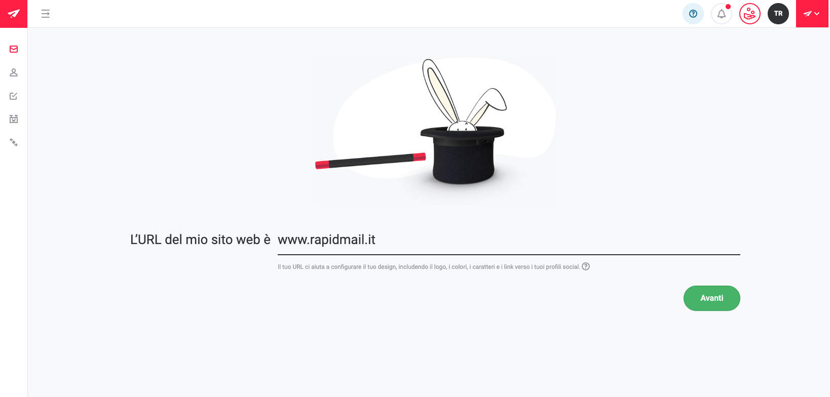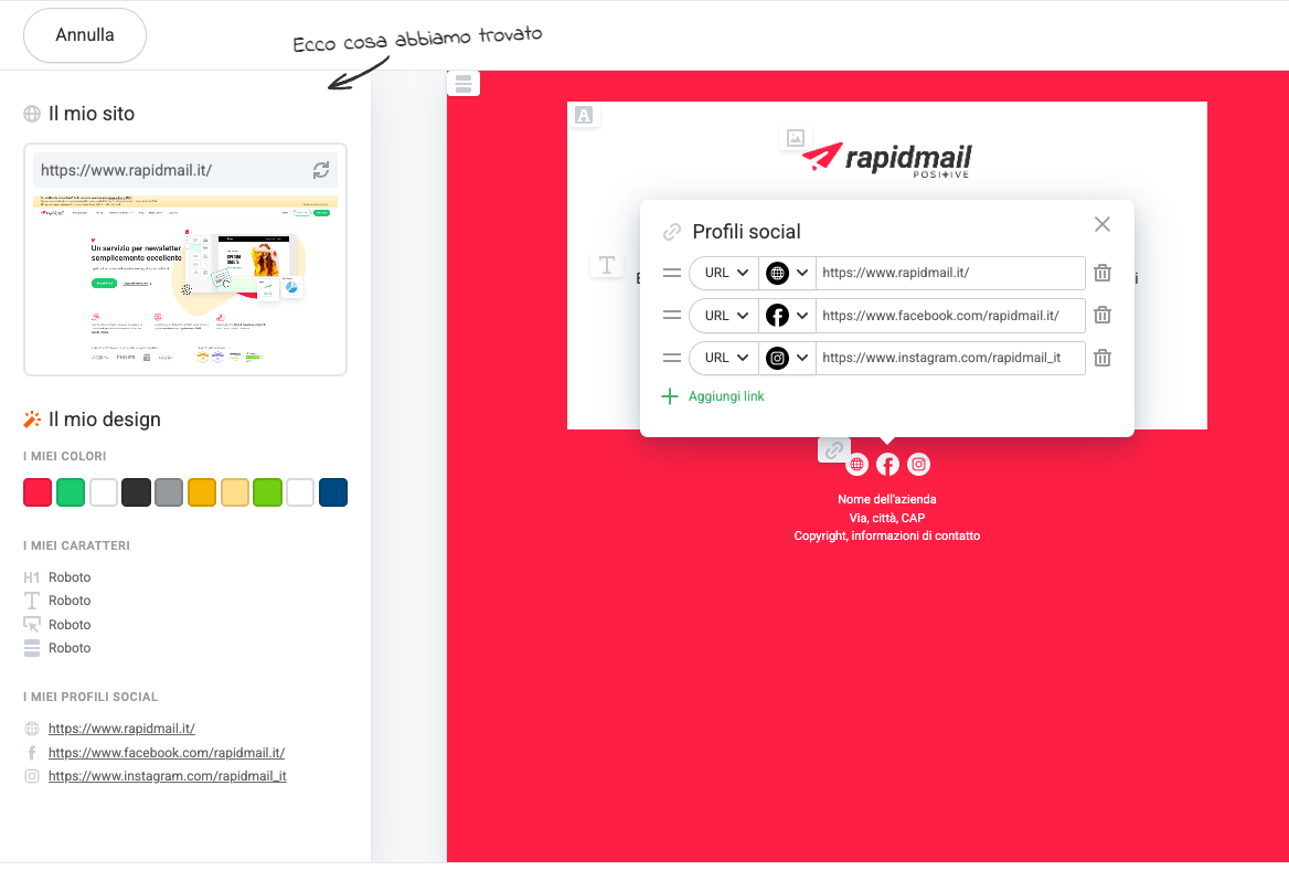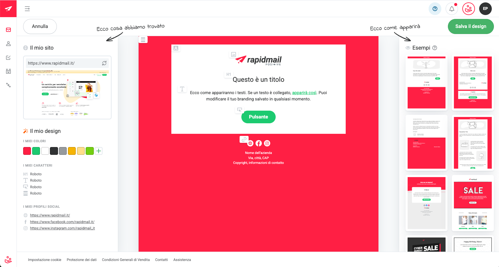Ecco come funziona: basta inserire l'URL del sito web e cliccare sul pulsante “Avanti”. Noi trasferiamo automaticamente i colori, i caratteri, il logo e persino i link social dal design aziendale ai nostri modelli di newsletter. Inoltre, se sul sito web della tua azienda utilizzi più loghi, il One Click Design ti offre anche diverse varianti del logo per il tuo modello di newsletter. Naturalmente puoi anche caricare un altro logo.