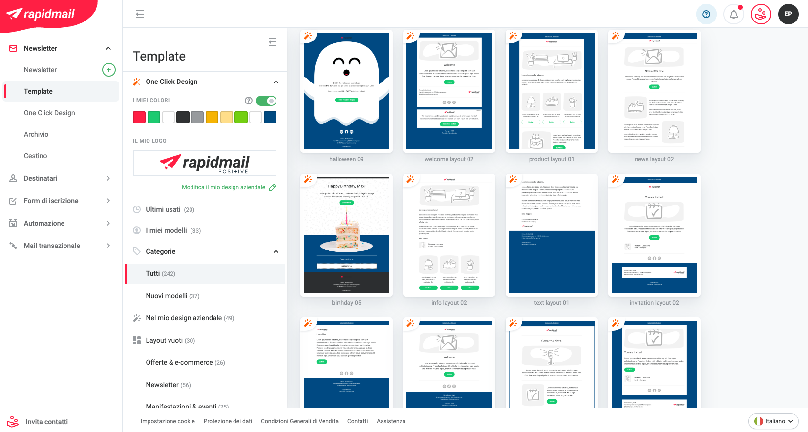 Ovviamente puoi continuare a utilizzare gli oltre 250 modelli di newsletter gratuiti di rapidmail. Il One Click Design è già applicabile ad alcuni di questi modelli e stiamo lavorando per rendere “One Click" anche altri modelli. In questo modo puoi inviare una newsletter anche in occasione di eventi stagionali come Pasqua, Natale o il Black Friday, che sarà personalizzata in base al design della tua azienda, ma allo stesso tempo avrà quel qualcosa in più che contraddistingue le occasioni speciali. ✨