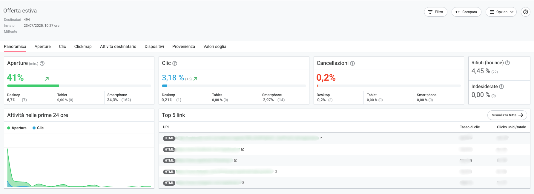 Ma non finisce qui: il 7% di chi ha aperto ha anche cliccato sul famoso pulsante “Scopri l’offerta”. Insomma, il contenuto non solo è stato letto, ma ha pure convinto qualcuno a fare un passo in più.