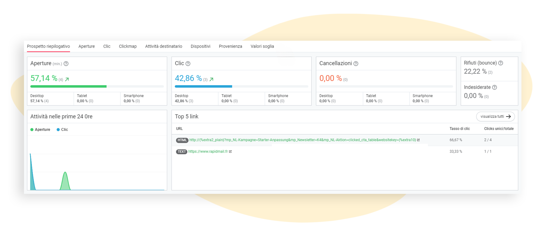 Su rapidmail, puoi monitorare ogni report in tempo reale e sfruttare strumenti come A/B test, mappa dei clic e statistiche dettagliate per destinatario. Questo ti consente di fare piccoli aggiustamenti che producono risultati concreti.