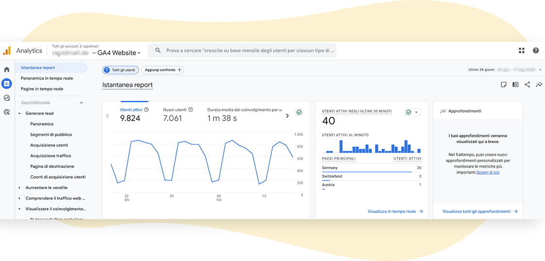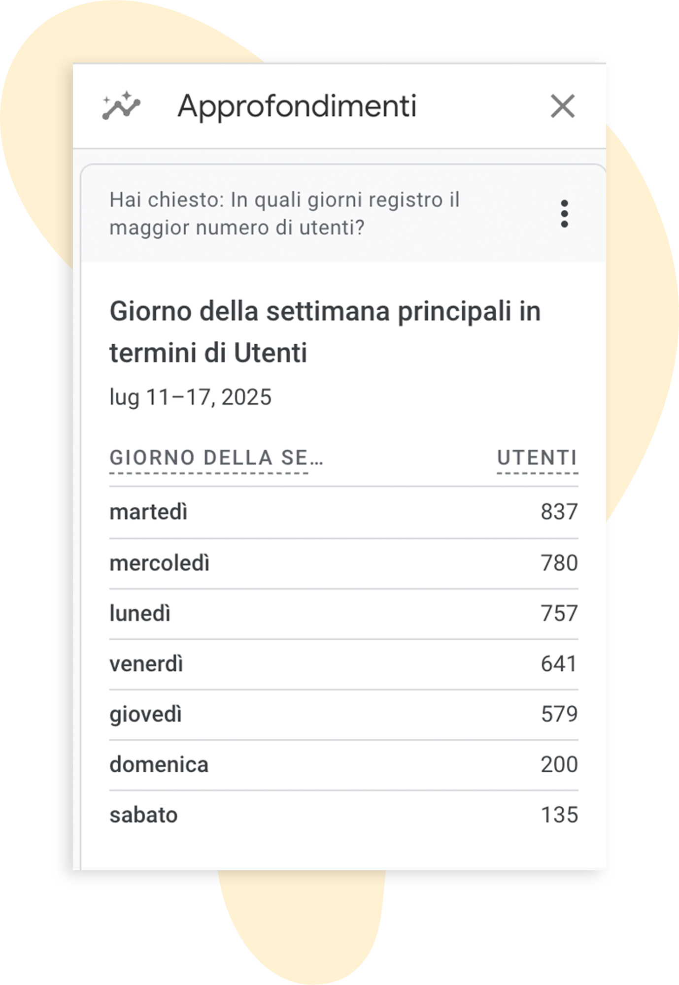 Per trovare l’orario migliore per l’invio newsletter, osserva anche i dati di traffico del tuo sito web o e-commerce. I momenti in cui gli utenti sono più attivi sul sito possono offrire ottimi spunti per sincronizzare l’invio della newsletter. Uno strumento utile per raccogliere queste informazioni è Google Analytics 4. All’interno dei report, troverai sezioni che offrono una panoramica dell’attività dei visitatori, come i giorni e gli orari in cui il sito riceve più traffico. Se ad esempio noti che il mercoledì c’è una concentrazione maggiore di visite, quello potrebbe essere un buon momento per testare l’invio della newsletter.