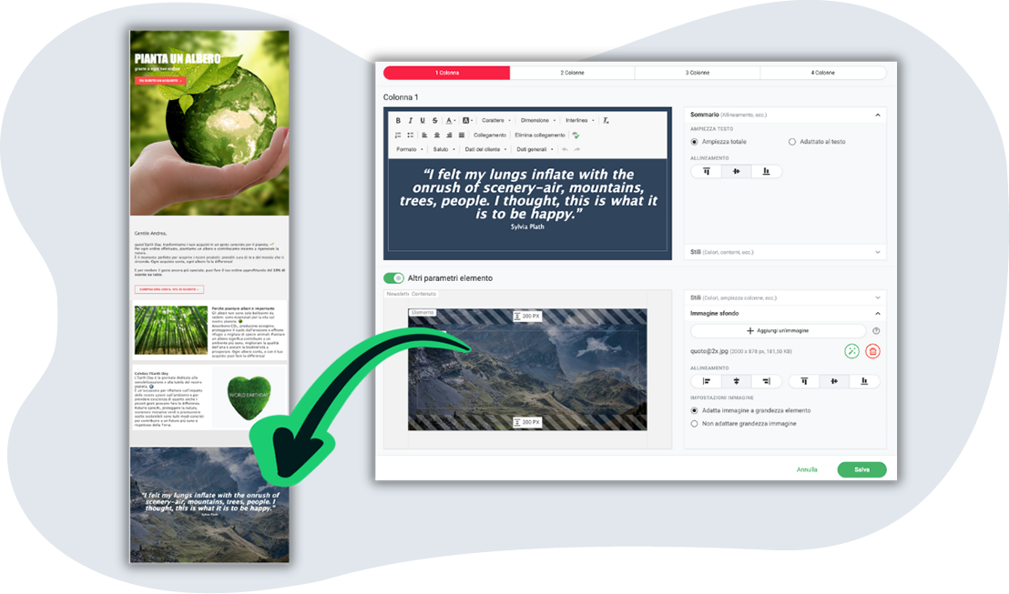 👉🏻 Un vantaggio di rapidmail è che puoi applicare lo sfondo solo a singoli blocchi, senza dover intervenire su tutta la newsletter. Questo ti dà maggiore controllo sul layout e ti permette di usare lo sfondo come accento visivo, guidando lo sguardo del lettore dove serve.