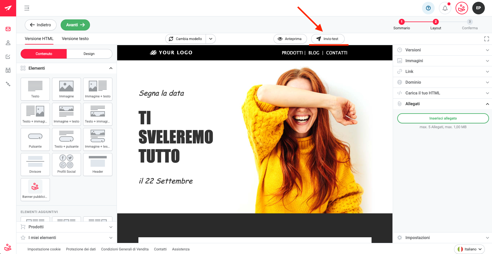 Una volta entrato nell’editor della newsletter, troverai nella parte superiore della pagina l’opzione dedicata all’invio di test.