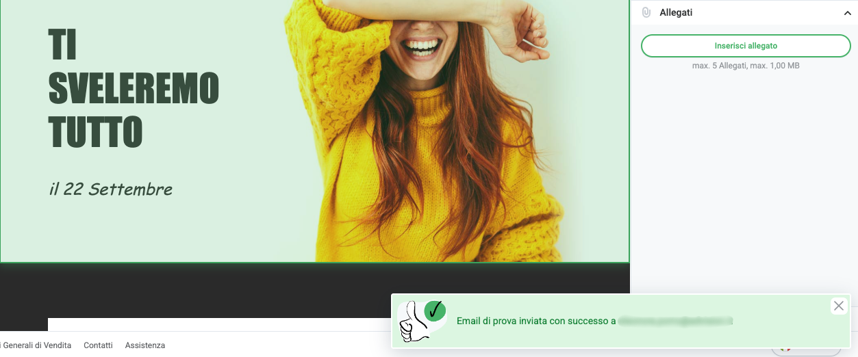 Se tutto è andato a buon fine, come passaggio successivo comparirà un riquadro verde nella parte inferiore della pagina che confermerà l’avvenuto invio dell’email di test.