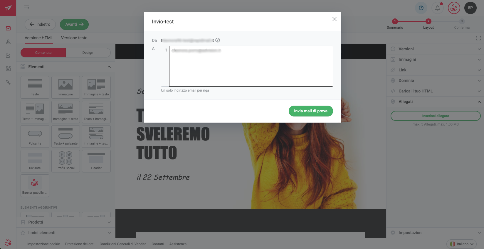L’invio di email di test simula il reale invio di una campagna. In pratica, nel contesto dell’email marketing, significa poter verificare a fondo diverse funzionalità e caratteristiche prima della spedizione definitiva. Tra queste rientrano, ad esempio, la leggibilità del testo, la corretta visualizzazione di immagini e grafiche, il funzionamento dei link e il modo in cui la newsletter viene mostrata su dispositivi diversi.
